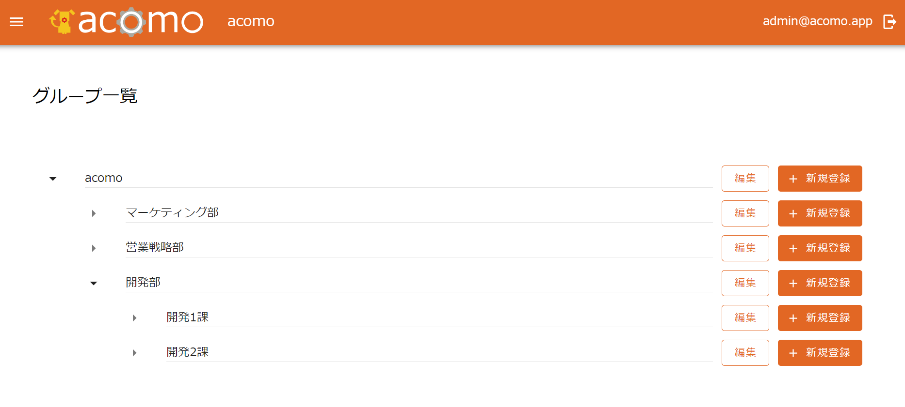 - 部・課など、組織を「グループ」とし、階層構造を定義できます。